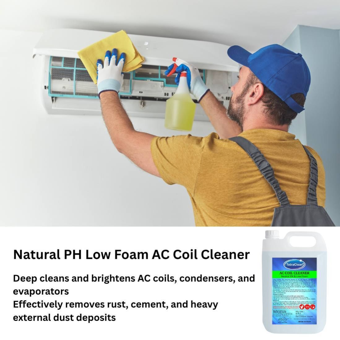 TetraClean AC Coil Cleaner (Neutral pH & Low Foam) effectively removes dust, oil, and dirt from AC coils without damaging aluminum, brass, or copper. It enhances cooling efficiency and ensures long-lasting AC performance