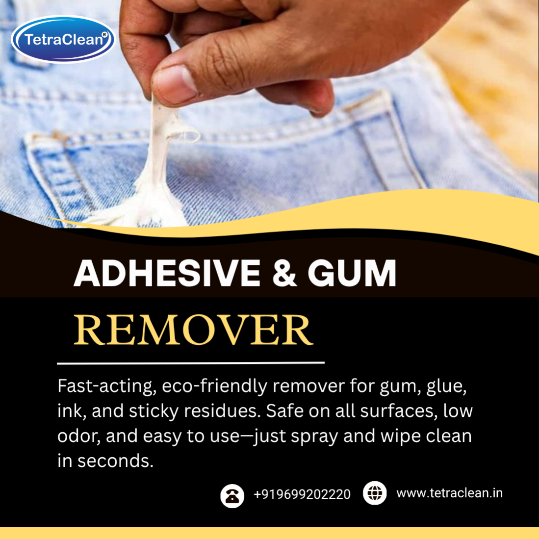 TetraClean Adhesive & Gum Remover quickly removes gum, glue, stickers, labels, and sticky residues in just seconds. Safe on all surfaces, eco-friendly, low odor, and easy to use—perfect for home, office, and industrial cleaning.