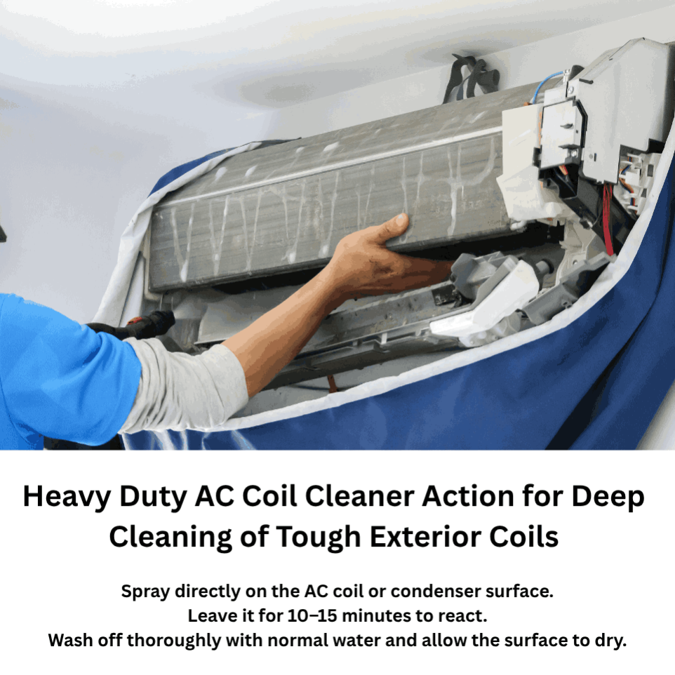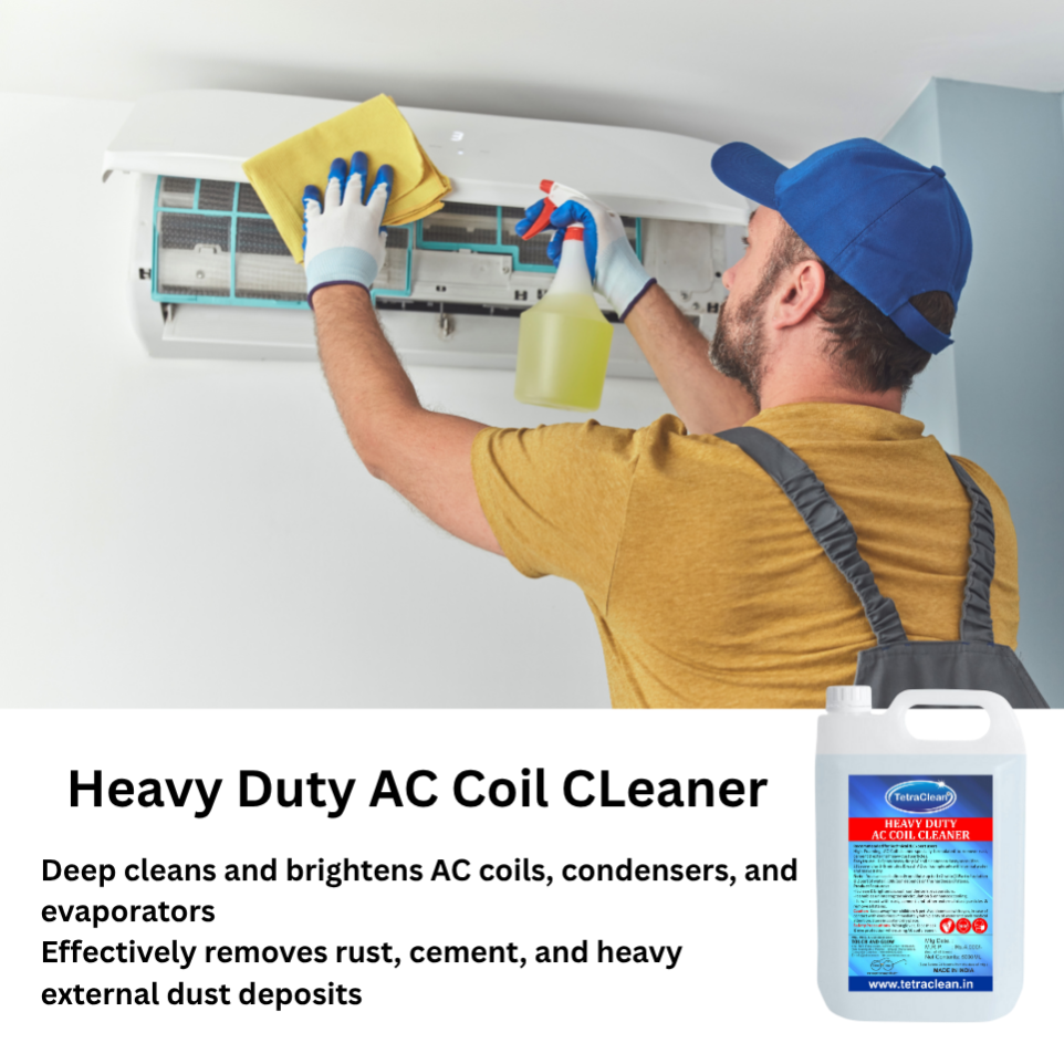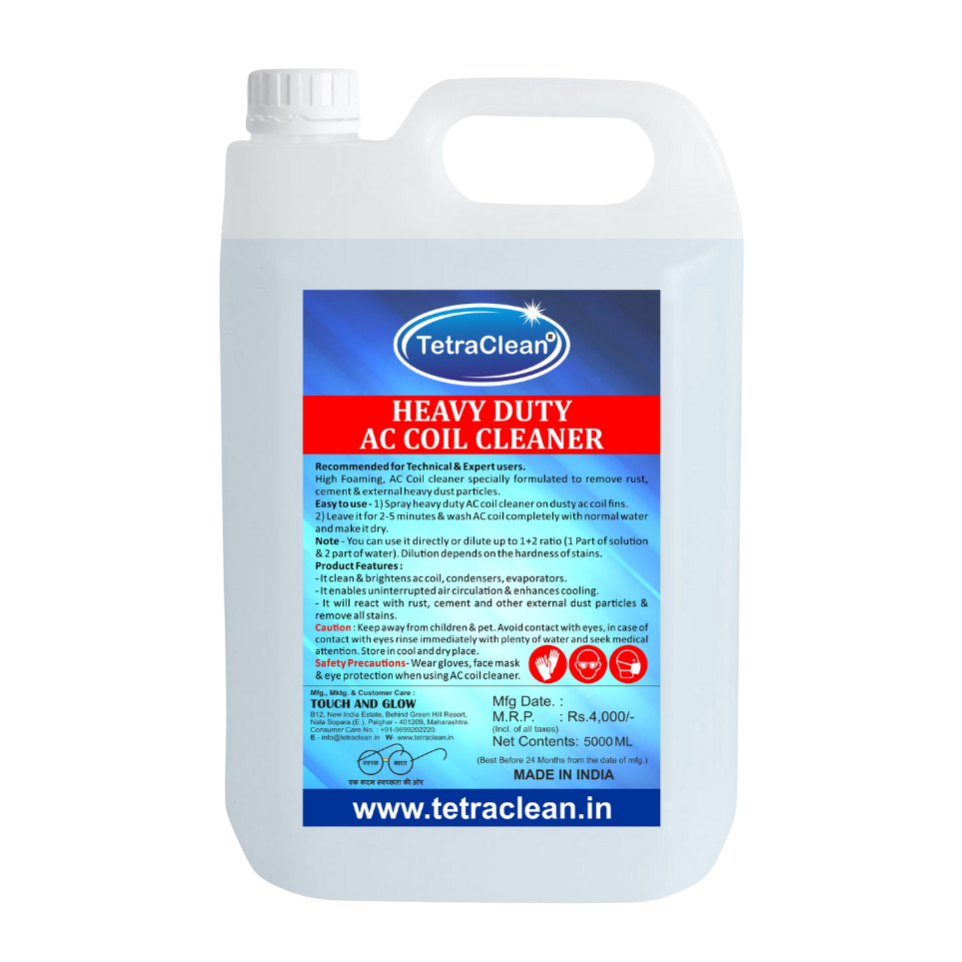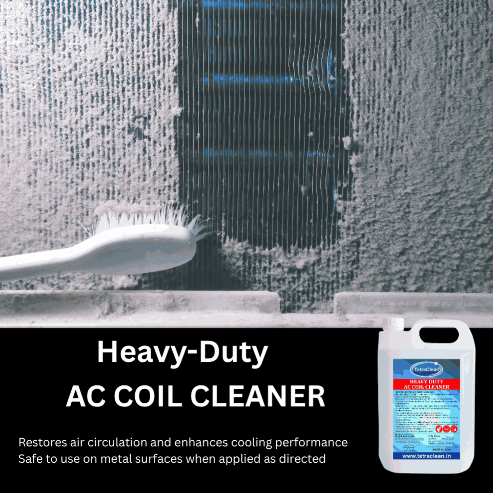 TetraClean Acidic & High Foam AC Coil Cleaner is specially formulated for cleaning heavily dusted and rusted AC coils, condensers, and evaporators. It effectively removes cement, rust, and stubborn external dust particles that normal cleaners fail to remove. Ensures uninterrupted airflow and enhances cooling performance.