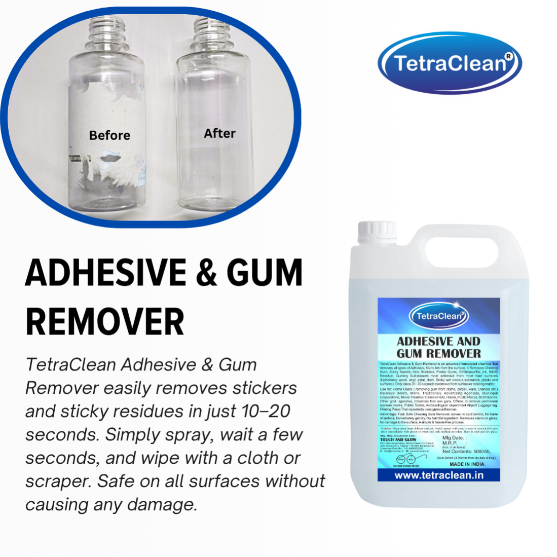 TetraClean Adhesive & Gum Remover – Fast & Safe Cleaner for Stickers, Gum, Glue & Sticky Residues (5 Litre)