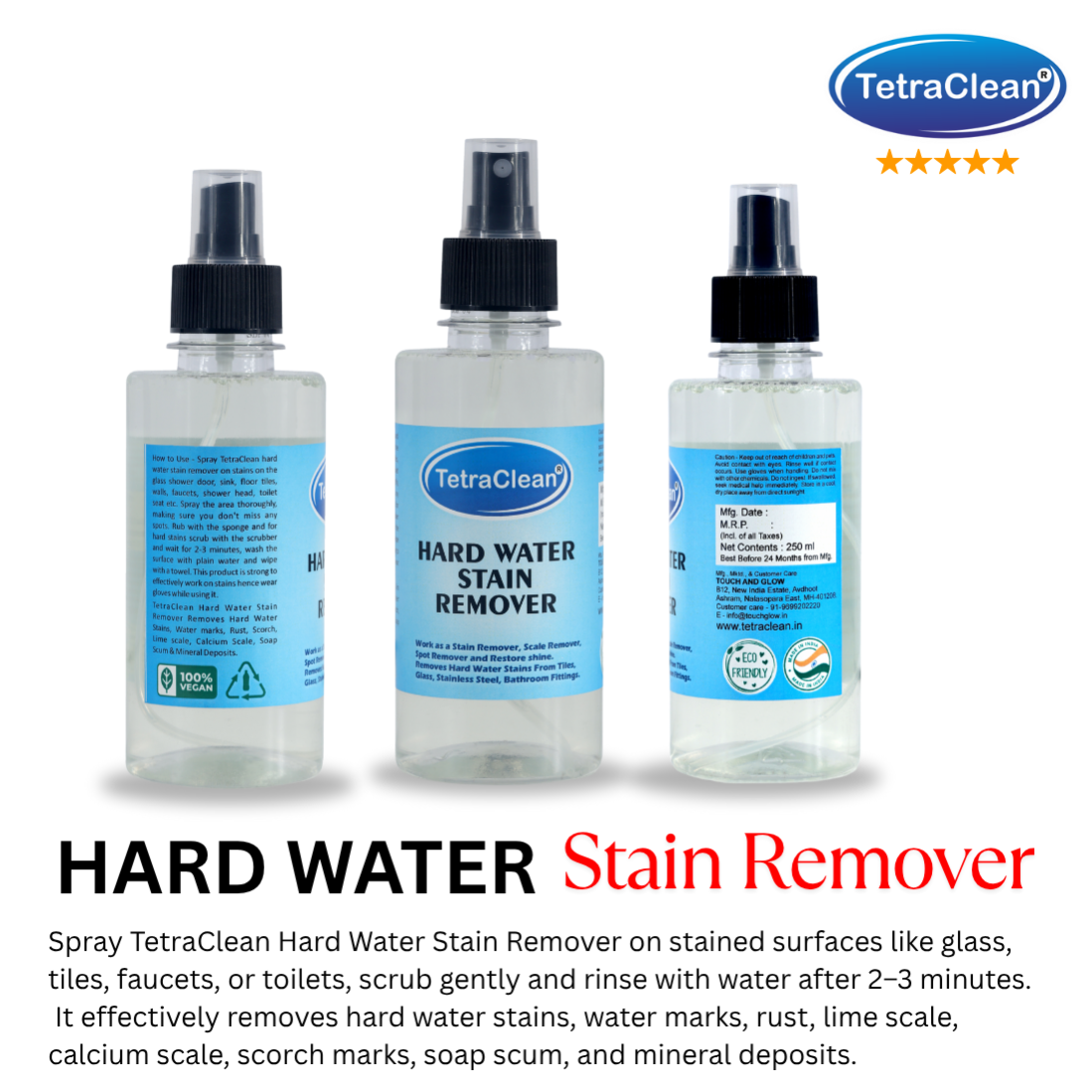 TetraClean Hard Water Stain Remover is a powerful yet safe cleaner specially formulated to eliminate stubborn hard water stains, limescale, calcium deposits, and mineral buildup from glass, tiles, faucets, bathroom fittings, and stainless steel surfaces.