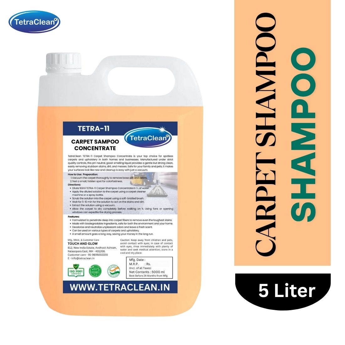 TetraClean TETRA-11 Carpet Shampoo Concentrate is a powerful deep-cleaning solution specially formulated to remove tough dirt, stains, and embedded grime from carpets and upholstery. Its advanced concentrated formula penetrates deep into carpet fibers to lift dust, spills, and stubborn marks while being gentle on fabric and safe for regular use. Designed for both residential and commercial environments, it effectively refreshes carpets, restores their original look, and leaves behind a clean and pleasant fragrance. Suitable for use with carpet cleaning machines or manual application, this economical 5-liter pack ensures long-lasting performance and cost-effective maintenance for homes, offices, hotels, and other high-traffic areas.