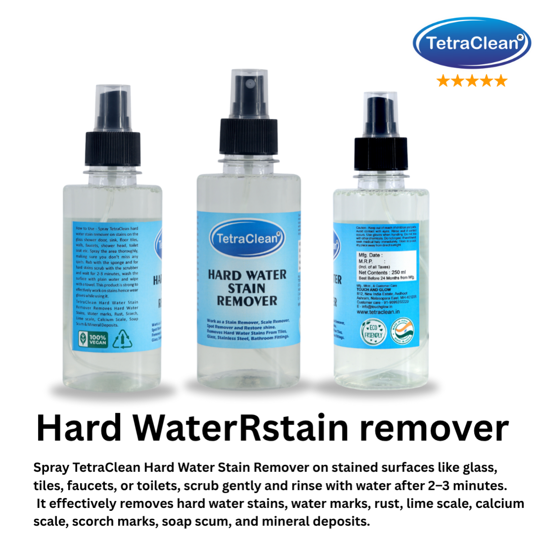 TetraClean Hard Water Stain Remover is a powerful yet safe cleaner specially formulated to eliminate stubborn hard water stains, limescale, calcium deposits, and mineral buildup from glass, tiles, faucets, bathroom fittings, and stainless steel surfaces.