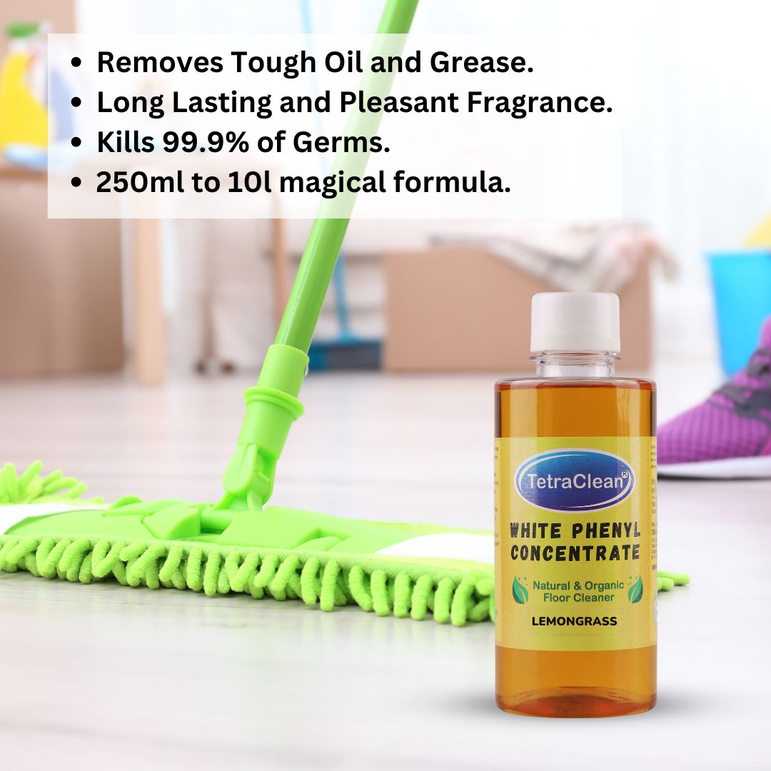 Enjoy long-lasting freshness and powerful cleanliness with TetraClean White Phenyl Concentrate (250ml) – Jasmine Variant. Made with natural and organic ingredients, this effective floor cleaner removes tough dirt, oil, grease, and germs while filling your home with a soothing jasmine fragrance.